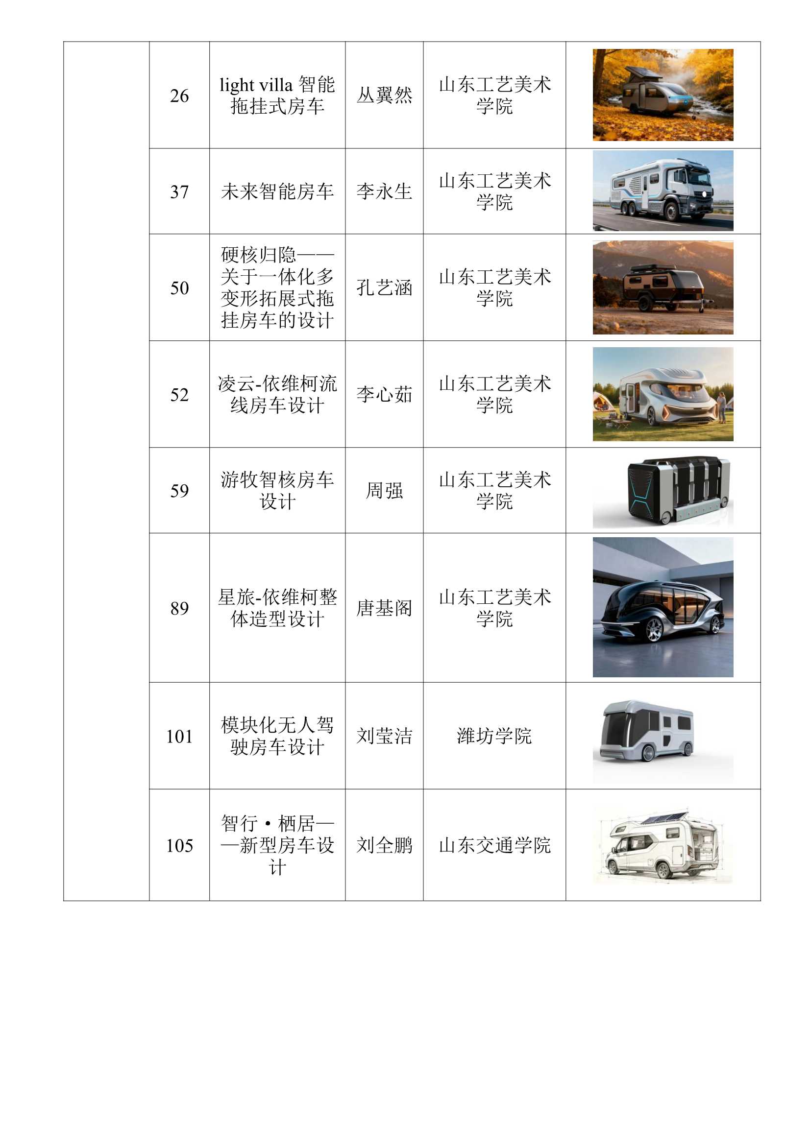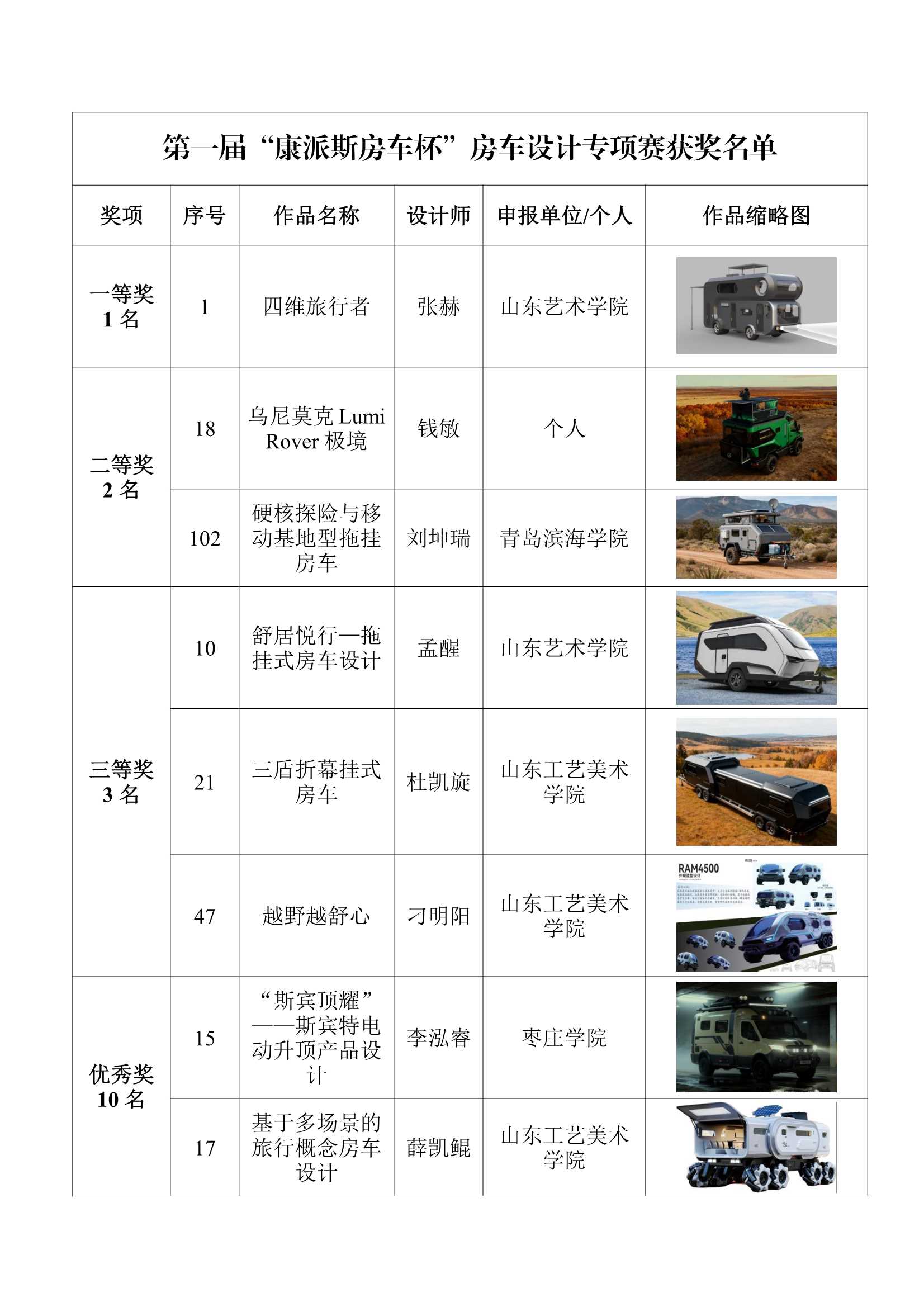 为激发房车设计领域新生力量的创新力,搭建起在校学生与行业实践之间的桥梁,推动房车产业向轻量化、智能化的高质量发展阶段迈进,荣成康派斯新能源车辆股份有限公司联合山东省工业设计协会举办了第一届“康派斯房车杯”房车设计专项赛。经初评公示后,于近日组织企业内部专家和行业专家进行了终评,现将拟定获奖作品名单公示如下: